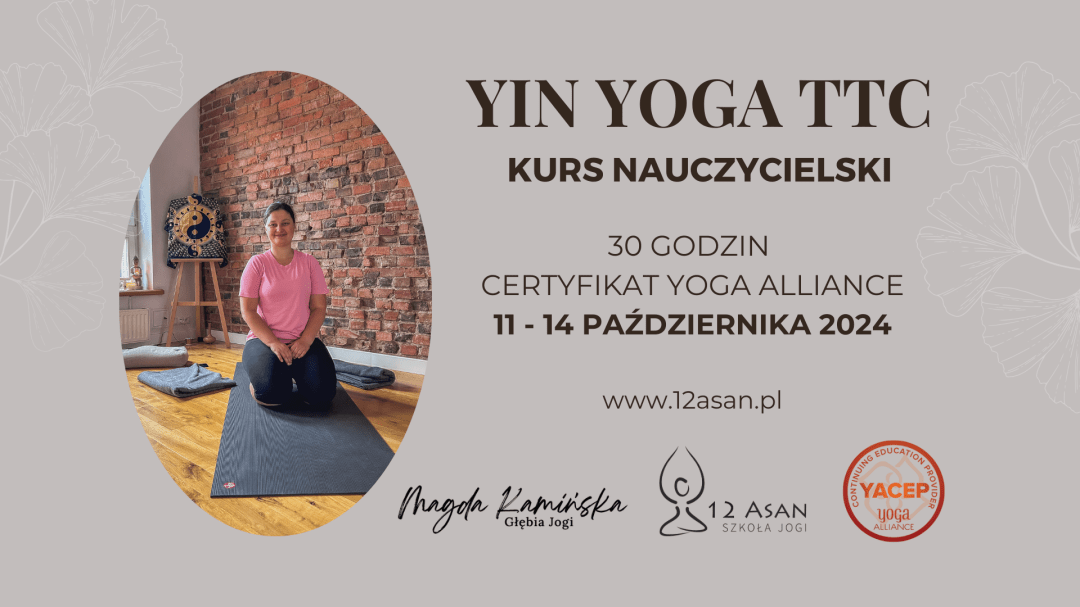 Druga edycja kursu nauczycielskiego yin jogi w Szkole jogi 12 asan. Kurs 30-godzinny zapewni ci kompetencje do nauczania spokojnej powięziowej odmiany jogi, jaką jest yin joga. Otrzymasz certyfikat w języku polskim i angielskim, który jest uznany przez światową organizację Yoga Alliance.