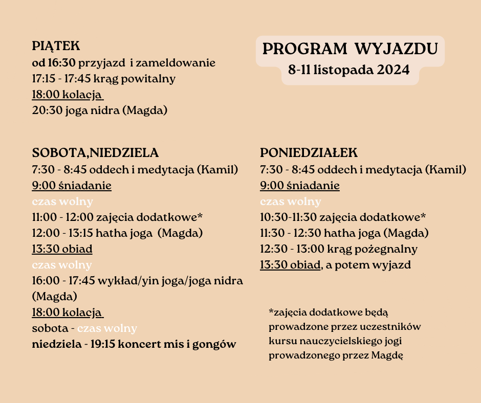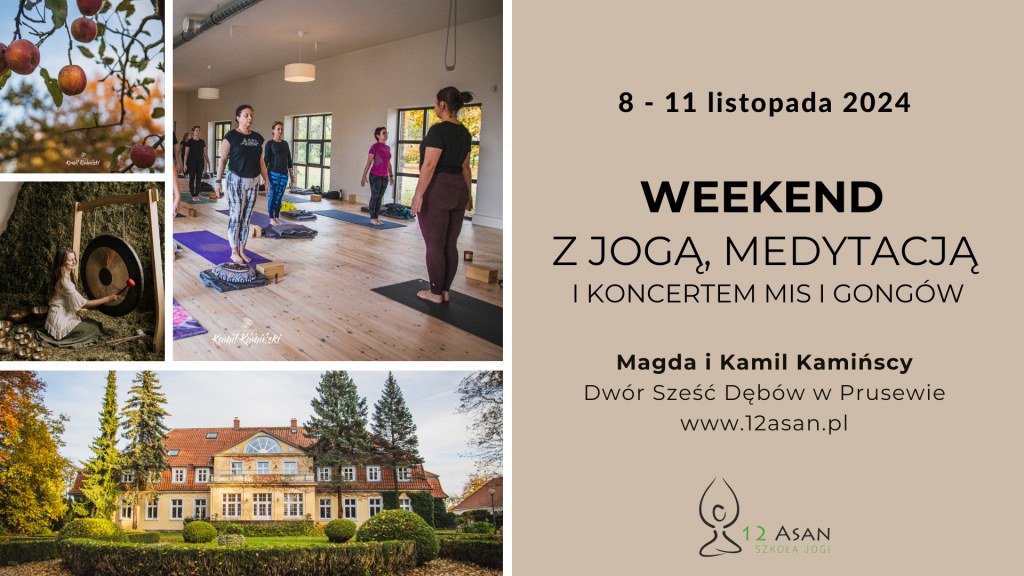Jesienny otulający weekend to wyjazd dla każdego, kto pragnie się wyciszyć i zaszyć na 4 dni w pięknym miejscu niedaleko morza. Bogaty program zajęć pozwoli ci doświadczyć holistycznej praktyki hatha jogi oraz spokojnej, rozciągającej yin jogi. Poranne zajęcia rozbudzą cię pogłębionym oddechem i prowadzoną medytacją. Wykłady z filozofii jogi pozwolą ci zrozumieć głębiej czym jest joga oraz jak może wzbogacić twoje życie. Popołudniowa joga nidra to będzie czas głębokiego relaksu i pełnego odprężenia. Dodatkowo, weźmiesz udział w koncercie mis i gongów, który przeniesie cię w świat magii. Zajęcia odbędą się w przepięknej i przestronnej, 140-metrowej sali do jogi z drewnianą podłogą. Nocować będziemy w komfortowych i eleganckich 1-2 osobowych pokojach z łazienkami. Nasycimy się pożywnymi posiłkami wegetariańskimi: śniadaniami, obiadami i kolacjami. W wolnym czasie będzie okazja do spacerów po dworskim parku z sześcioma dębami lub krótkiego wypadu nad morze, a także integracji np. podczas gry w karty. Dodatkowo, będzie możliwość skorzystania z sauny i masaży oraz zabiegów. Wyjazd przeznaczony jest dla wszystkich chętnych, nie potrzeba wcześniejszego doświadczenia.