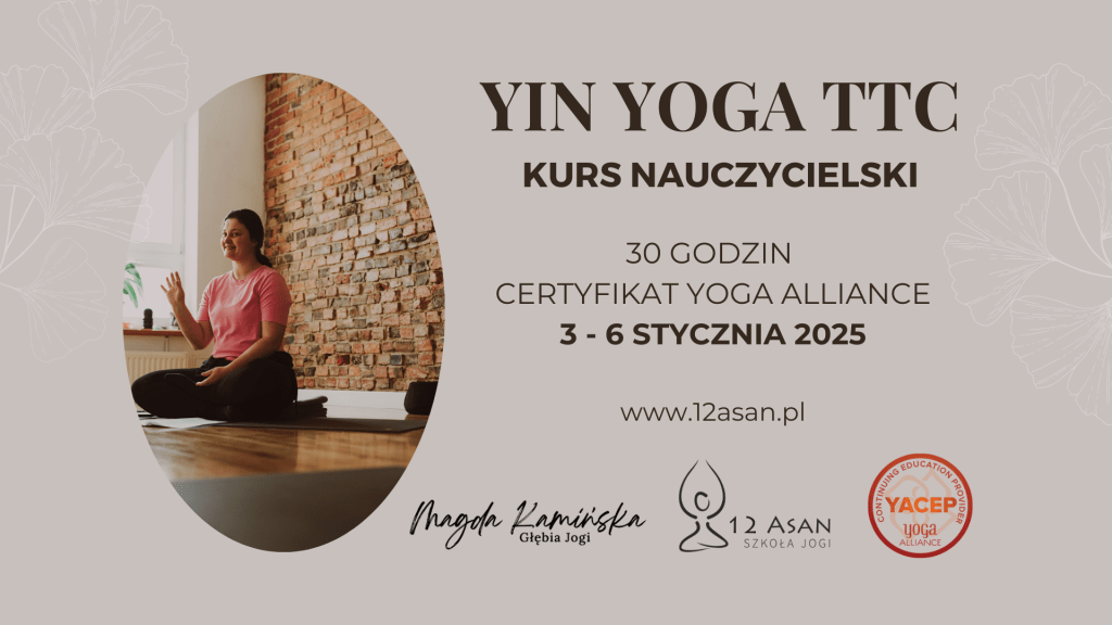 Trzecia edycja kursu nauczycielskiego yin jogi w Szkole jogi 12 asan. Kurs 30-godzinny zapewni ci kompetencje do nauczania spokojnej powięziowej odmiany jogi, jaką jest yin joga. Otrzymasz certyfikat w języku polskim i angielskim, który jest uznany przez światową organizację Yoga Alliance.