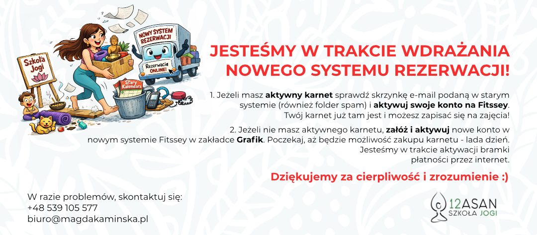 Szkoła jogi 12 asan to miejsce, w którym możesz nauczyć się praktyki jogi od podstaw. Tworzymy kameralną przestrzeń, w której chcemy, abyś poczuł się jak u siebie. U nas możesz się rozwijać na wszystkich poziomach. Twoje ciało będzie się stawać silne i elastyczne, a umysł czysty i skoncentrowany. Znajdziesz tutaj przestrzeń na pełen relaks, dzięki któremu możesz odnaleźć spokój wewnętrzny. Zapraszamy Cię we wspólną podróż do poznania jogi.