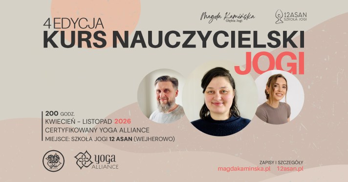 Jestem niezmierny wdzięczny, że Przestrzeń skierowała mnie w To Miejsce. Cudowna osobowość zarówno Magdy jak i Kamila, Ich cierpliwość, łagodność, pozwały przejść każdy etap nauki w ten właściwy dla Jogi sposób. Jeżeli zastanawiasz się jaką Szkołę Jogi wybrać, to z całego serca mogę polecić właśnie Szkołę Magdy i Kamila „12 Asan” w Wejherowie. Tu padają mity zarówno o miejscu, jak, że „Wejherowo, to koniec świata..”- a tak naprawdę, jest to piękne i przyjazne miasto z urokliwym klimatem. Drugi mit, to, że trudno zostać Nauczycielem Jogi, i, że jest to tylko dla wybranych. Jeżeli czujesz, że „coś” Cię do tego ciągnie, to jest to najlepszy moment, niezależnie od Twoich obaw czy sprawności. Z Magdą i Kamilem dasz radę Piotr Czapliński – opinia zarejestrowanego absolwenta na Yoga Alliance